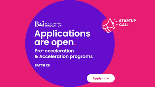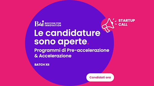 08La dodicesima Startup Call di B4i - Bocconi for innovation per i programmi di Accelerazione e Pre-accelerazione che inizieranno a settembre 2025 è ufficialmente aperta! È possibile presentare la propria candidatura entro il 22 giugno 2025.